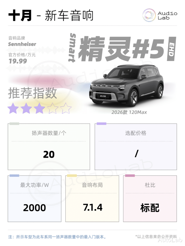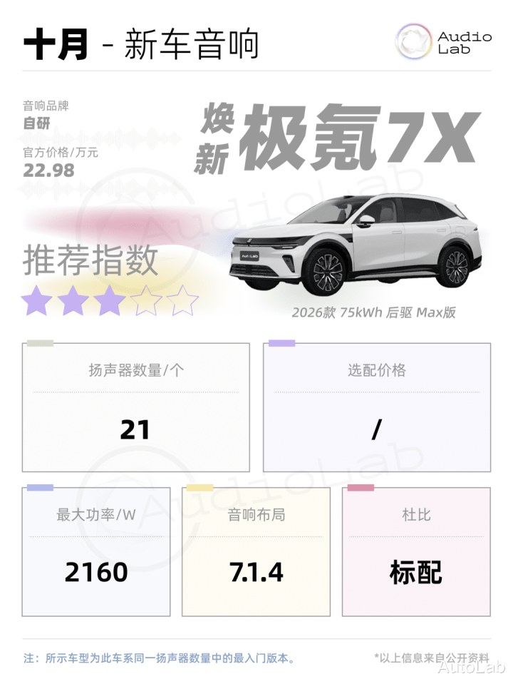 我们也汇总了一期音响新车周报,为了能让大家更直观地感受,我们这一次依然从硬件基础、系统功能、整车价格及选装费、音源生态、以及创新性多个维度进行了主观的综合评分。
