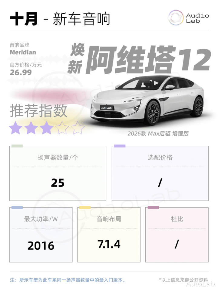 2026款阿维塔12相较于旧款,在硬件参数上没有太多变动。比较显著的是原先7.1的声道布局升级为7.1.4,增强了对环绕包裹感的打造。